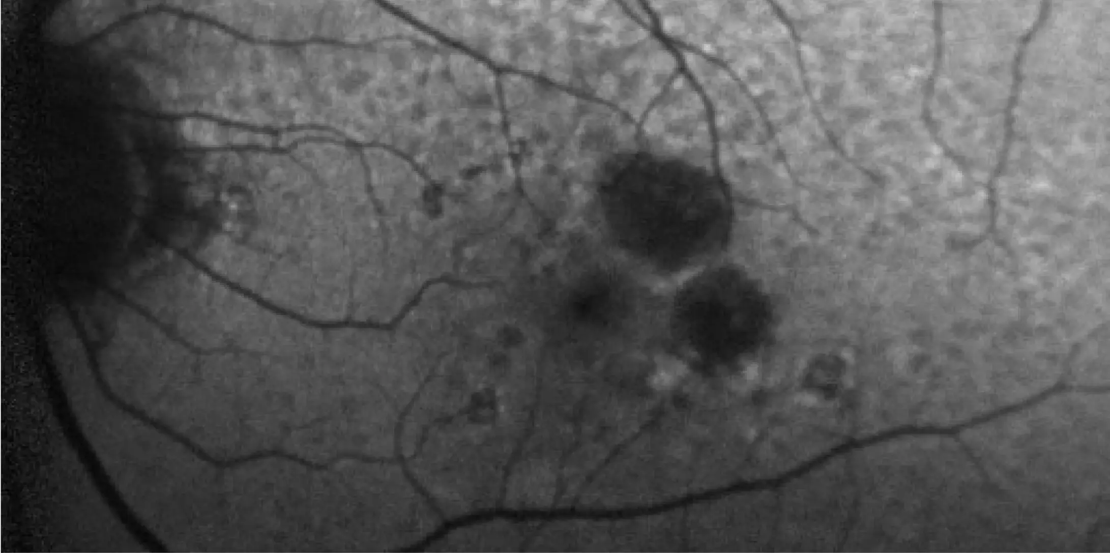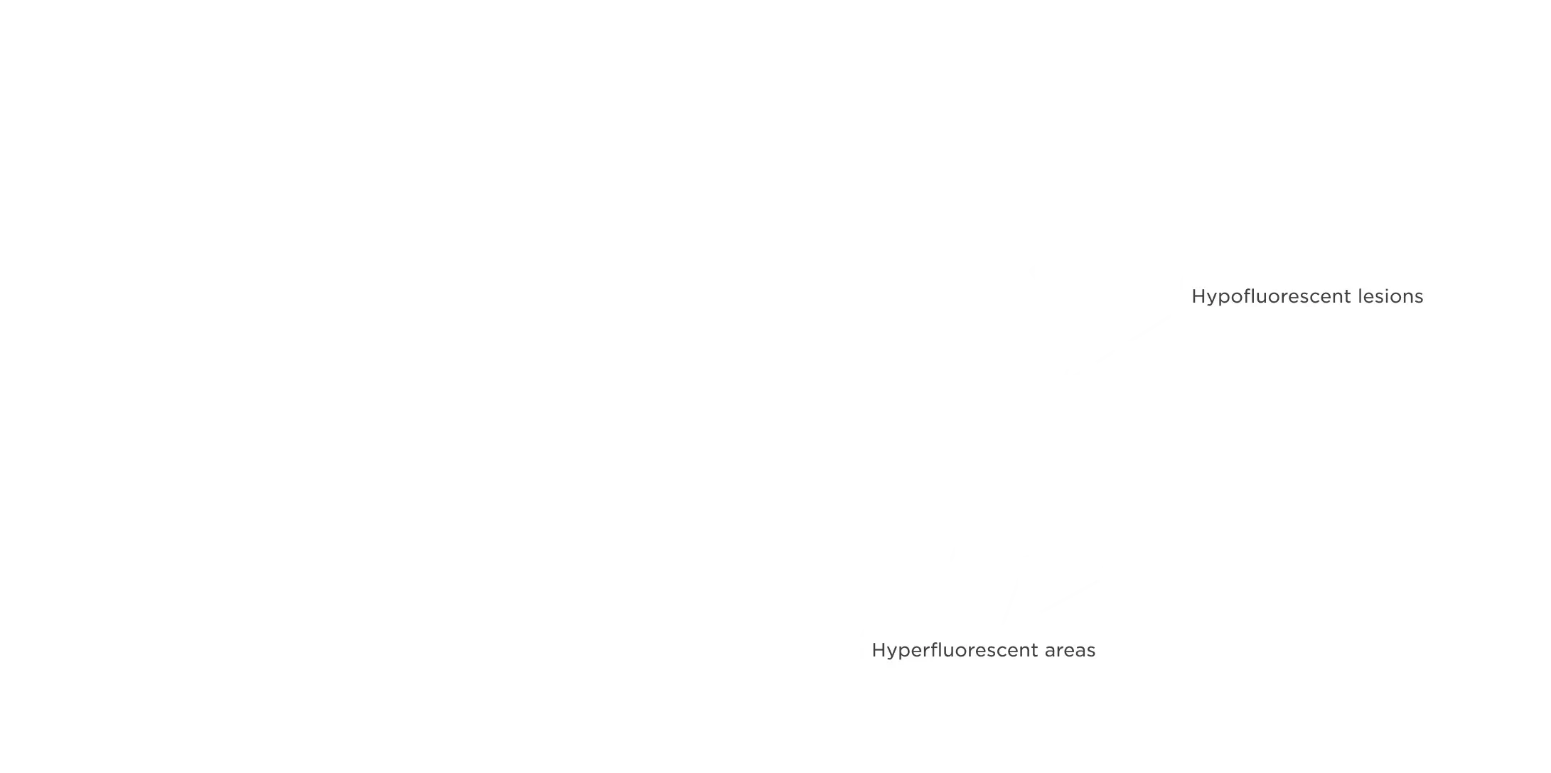 Dark hypofluorescence indicates areas of atrophic lesions, whereas lighter hyperfluorescent areas highlight accumulation of lipofuscin, which is prognostic of GA progression.2