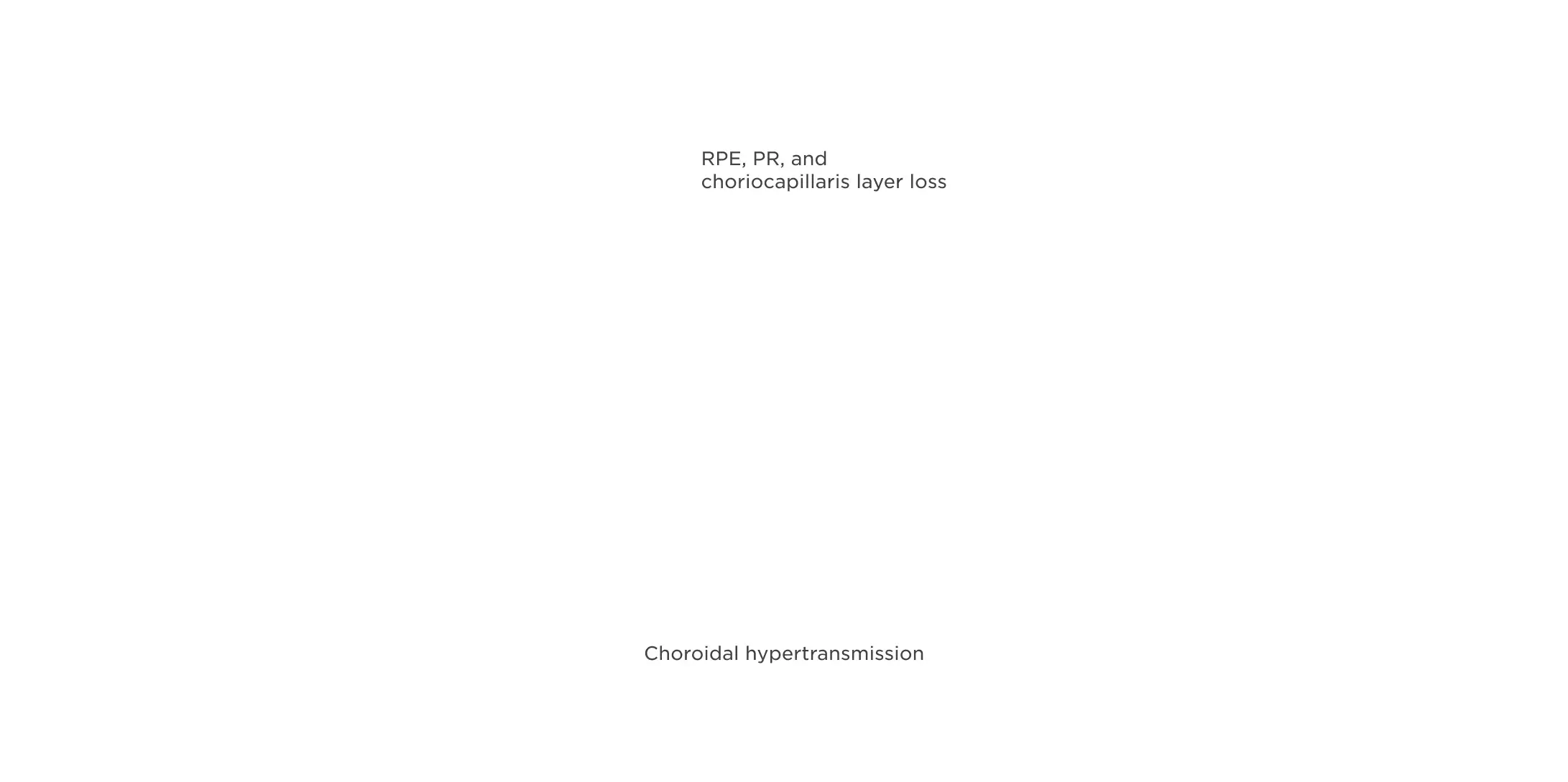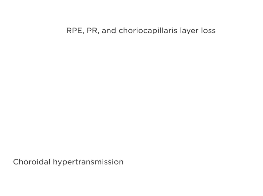 Hypertransmission defects through the choroid point to areas of absent retinal pigment epithelium (RPE), photoreceptors (PR), and choriocapillaris layers.2